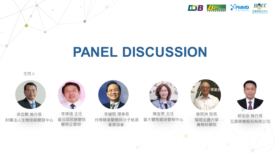 會中特別邀請臺大公衛學院陳秀熙教授、臺大醫院感染管制中心陳宜君主任、陽明交大藥物科學院康照洲院長、互貴興業郭加泳執行長、台北榮總醫務企管部李偉強主任、台灣分子檢測產業協會李鍾熙理事長等六位國內專家學者,從學研界、醫界和產業界的觀點,針對新冠肺炎(COVID-19)快篩檢測及應用,進行深入探討。