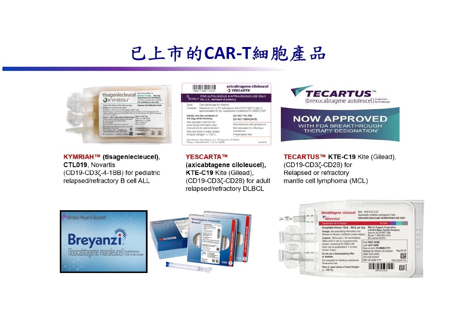 這個成功的案例開啟無數年輕白血病患者治癒的曙光,也帶動產業發展的新商機。目前全球已經有五個CAR-T相關產品上市,分別是由Novartis、Kite/Gilead、BMS/Celgene/ Juno、BMS/Bluebird,這幾家公司所開發的。