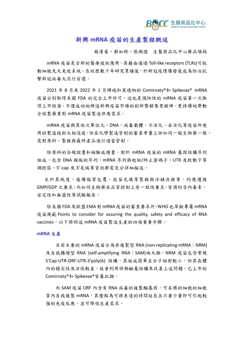 新興mRNA疫苗的生產製程概述
