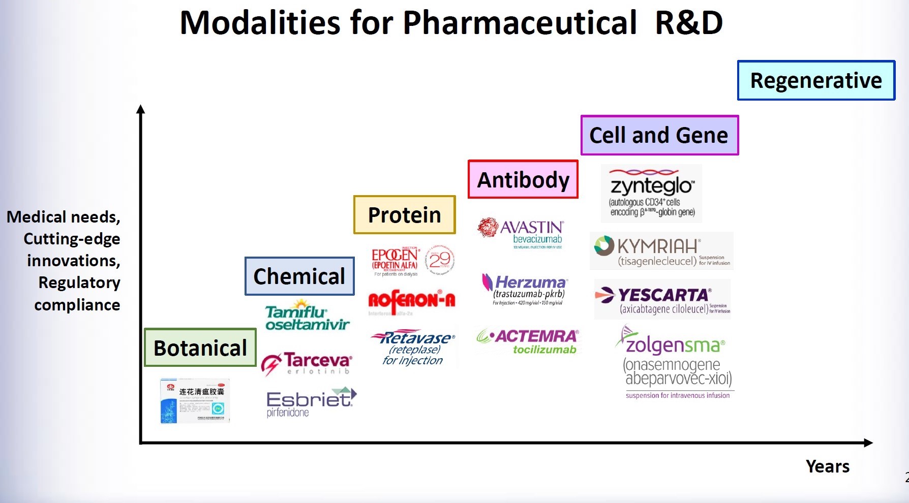 由於疾病治療在這段時間以來,出現許多創新的醫療技術,從小分子化學藥物、植物藥、蛋白質藥物、抗體藥物,一直到現在熱門的細胞與基因治療、再生醫療藥物,雖然技術的門檻越來越高、系統越來越複雜,但能夠解決的問題和疾病也更多,以前被視為絕症或無藥可治的疾病都出現治癒的曙光。